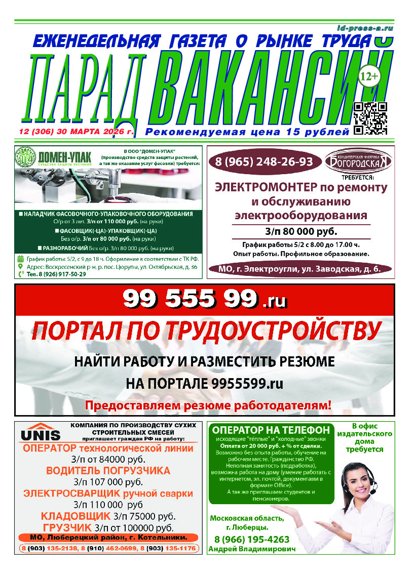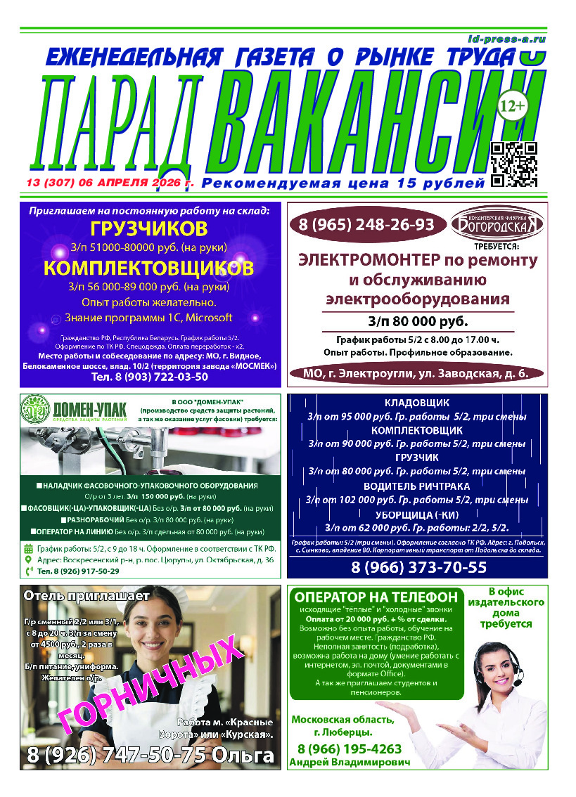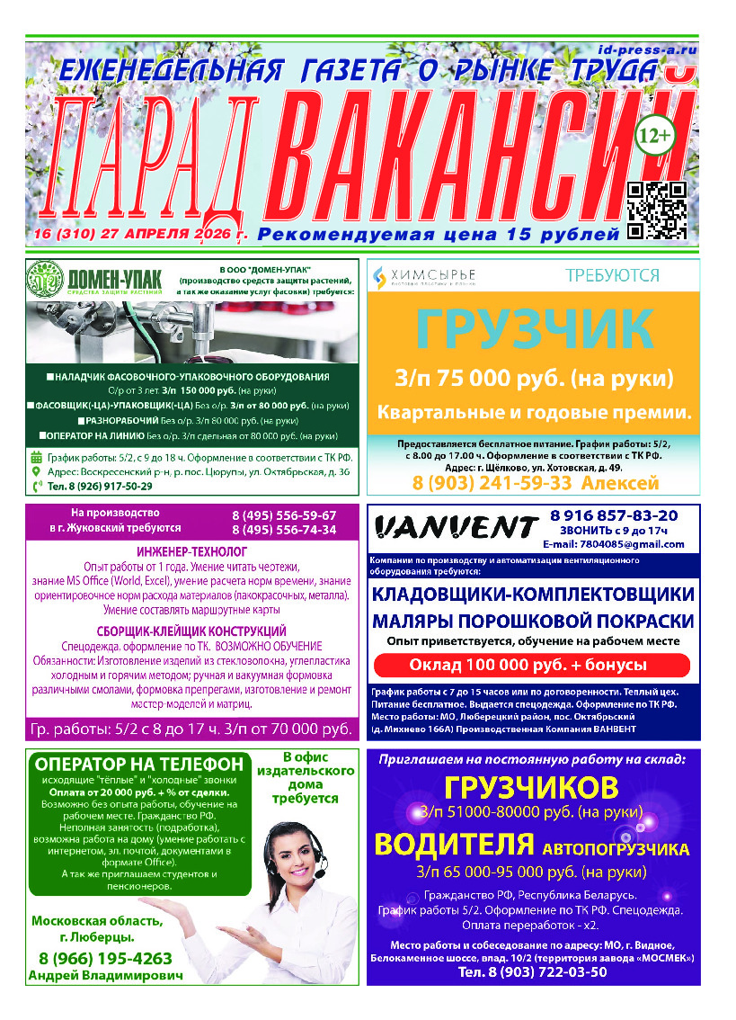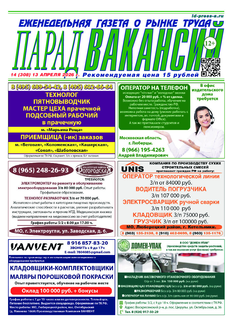 ID-PRESS-A.RU — официальный сайт еженедельного цветного печатного издания по трудоустройству в Москве и Московской области "ПАРАД ВАКАНСИЙ". Периодическое издание о рынке труда, выходящее под постоянным названием "ПАРАД ВАКАНСИЙ", имеет формат А3, полноцвет. Территориально газета распространяется у станций метро Москвы, железнодорожных вокзалах и ключевых станций пригородного сообщения Московской области, выкладывается в МФЦ Московского региона. Тематика газеты "ПАРАД ВАКАНСИЙ" - вакансии и трудоустройство населения в Москве и Московской области.